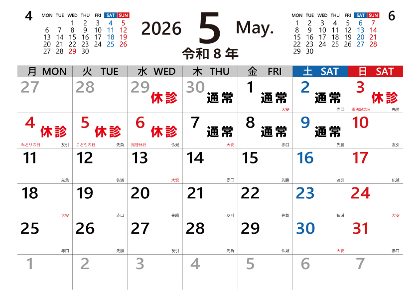 ゴールデンウィーク休診日のご案内 2026 4/13 お知らせ 2026年4月13日 お薬が必要な患者様はお早めの受診をお願い致します。 お電話のご予約 072-998-6300 受付時間 / 午前 9:00 - 12:00 午後 16:00 - 19:30 Webでのお問い合わせ お問い合わせ お知らせ よかったらシェアしてね! URLをコピーしました! URLをコピーしました! 臨時休診のお知らせ 関連記事 臨時休診のお知らせ 2025年12月1日 臨時休診のお知らせ 2025年10月11日 臨時休診のご案内 2025年9月19日 整形外科内山医師の診療再開について 2025年8月26日 診療科目・診療時間変更のお知らせ 2025年7月1日 一般皮膚科・美容皮膚科診療始まりました! 2025年6月30日